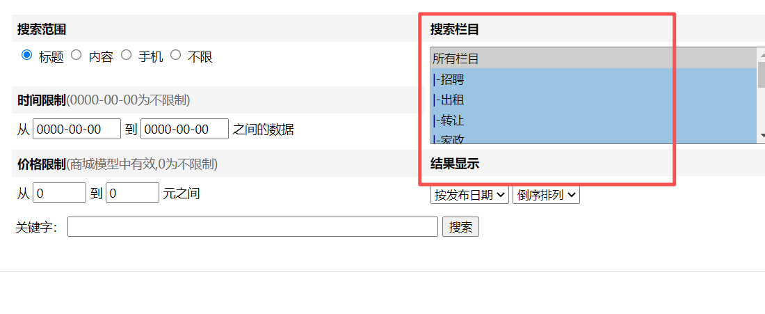 <form action='[!--news.url--]e/search/index.php' method="post" name="search_news" id="search_news"> <table width="100%" border="0" cellspacing="0" cellpadding="0"> <tr> <td width="54%"><table width="100%" border="0" cellpadding="6" cellspacing="0"> <tr> <td bgcolor="#F4F4F4"><strong>搜索范围</strong></td> </tr> </table></td> <td width="46%"><table width="100%" border="0" cellpadding="6" cellspacing="0"> <tr> <td bgcolor="#F4F4F4"><strong>搜索栏目</strong></td> </tr> </table></td> </tr> <tr> <td valign="top"><table width="100%" border="0" cellpadding="6" cellspacing="0"> <tr> <td><input type="radio" name="show" value="title" checked="checked" /> 标题 <input type="radio" name="show" value="smalltext" /> 内容 <input type="radio" name="show" value="mycontact" /> 手机 <input name="show" type="radio" value="title,smalltext,mycontact" /> 不限</td> </tr> </table> <br /> <table width="100%" border="0" cellpadding="6" cellspacing="0"> <tr bgcolor="#F4F4F4"> <td><strong>时间限制</strong><font color="#666666">(0000-00-00为不限制)</font></td> </tr> <tr> <td height="30" valign="top">从 <input name="starttime" type="text" value="0000-00-00" size="12" onclick="setday(this)" /> 到 <input name="endtime" type="text" value="0000-00-00" size="12" onclick="setday(this)" /> 之间的数据</td> </tr> <tr> <td bgcolor="#F4F4F4"><strong>价格限制</strong><font color="#666666">(商城模型中有效,0为不限制)</font></td> </tr> <tr> <td>从 <input name="startprice" type="text" id="startprice" value="0" size="6" /> 到 <input name="endprice" type="text" id="endprice" value="0" size="6" /> 元之间</td> </tr> </table></td> <td valign="top"><table width="100%" border="0" cellspacing="6" cellpadding="0"> <tr> <td><select name="classid" size="8" id="select2" style="width: 100%;height:112px"> <option value="0" selected="selected">所有栏目</option> [!--class--] </select></td> </tr> </table> <table width="100%" border="0" cellpadding="6" cellspacing="0"> <tr> <td bgcolor="#F4F4F4"><strong>结果显示</strong></td> </tr> <tr> <td height="30"><select name="orderby" id="select4"> <option value="">按发布日期</option> <option value="id">信息ID</option> <option value="plnum">评论数</option> <option value="onclick">人气</option> <option value="totaldown">下载数</option> </select> <select name="myorder" id="select5"> <option value="0">倒序排列</option> <option value="1">顺序排列</option> </select> </td> </tr> </table></td> </tr> </table> <table width="100%" border="0" cellpadding="4" cellspacing="0"> <tr> <td>关键字: <input name="keyboard" type="text" id="keyboard2" size="60" /> <input type="submit" name="Submit22" value="搜索" /> </td> </tr> </table> </form>